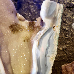 Standing geodes are approachable, flat-based crystals that stand upright, showcasing hollow interiors filled with sparkling points. This blue lace agate geode is framed by beautifully marked banding around the rim, highlighting the stone’s natural layers and soft blue tones. Perfect for display, meditation, or gifting, standing geodes symbolise inner growth, abundance, and natural beauty, making them meaningful and eye-catching additions to any home or collection.