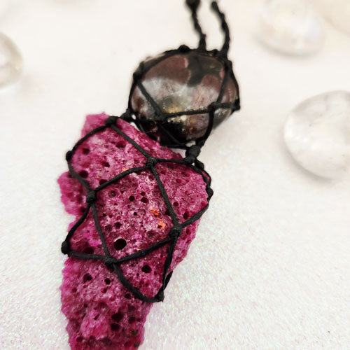 Man Made Ruby w. Astrophylite Wrapped Pendant (hand crafted in Aotearoa New Zealand)