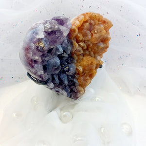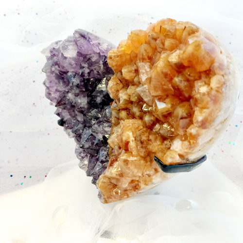 Amethyst & Citrine Split Cluster Heart (citrine is heat treated. approx. 18.5x18.8cm w. stand)