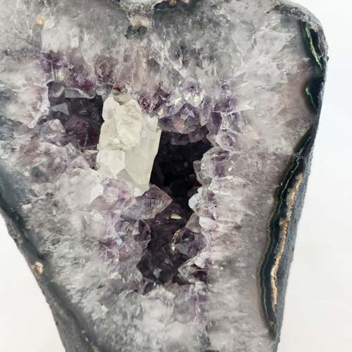 This Amethyst Geode is cherished for its calming energy, spiritual protection, and intuitive clarity. Formed as a natural hollow cavity lined with shimmering amethyst crystals, each amethyst geode is believed to gently radiate soothing, uplifting energy into its surroundings.