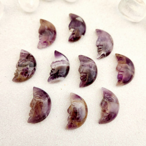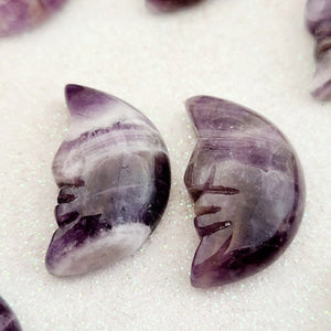 Each crescent moon is hand-shaped, meaning no two pieces are identical in their banding arrangement, colour distribution, or exact proportions. The surface is typically polished to a smooth finish that highlights the natural contrast between the purple and white layers. Natural variation in colour depth, banding width, and overall tone is completely normal and part of what makes each piece its own.