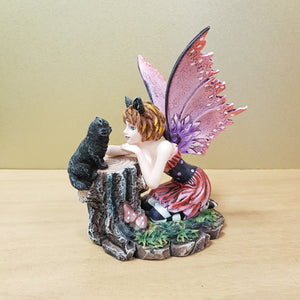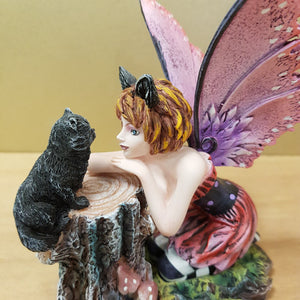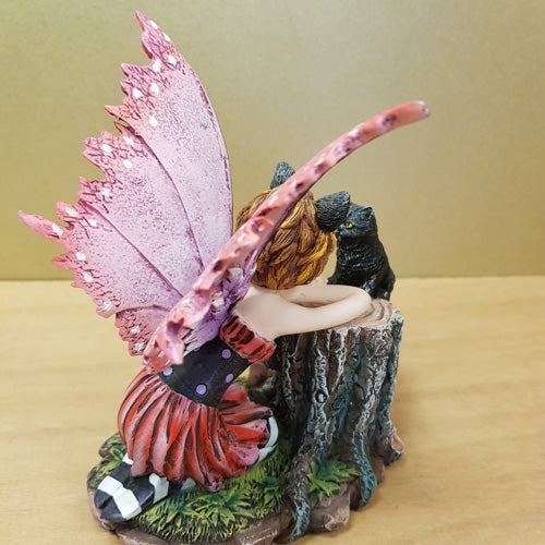 Fairy & Cat on Tree Stump (approx. 13.5x8x7cm)