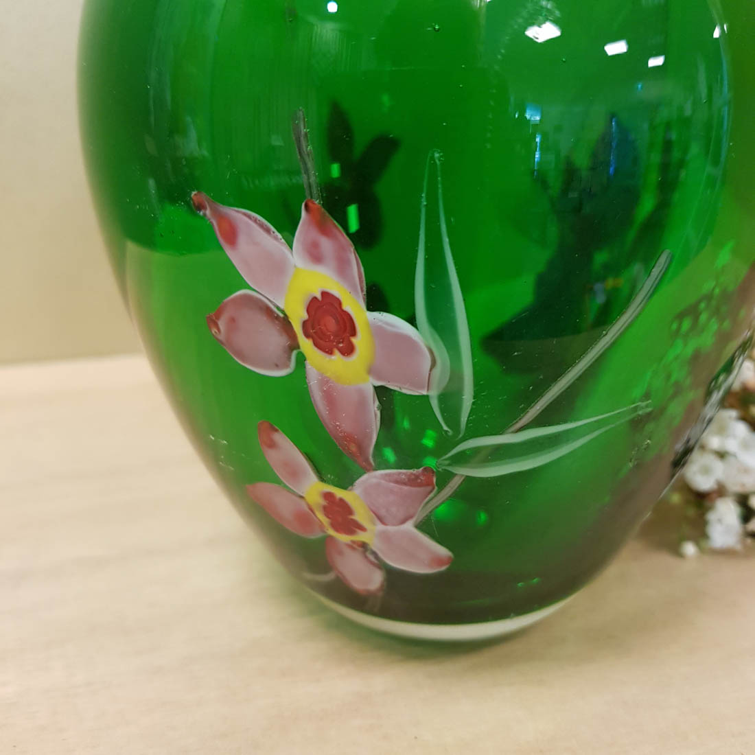 Green Glass Vase with Flowers (approx. 13.5x11cm)